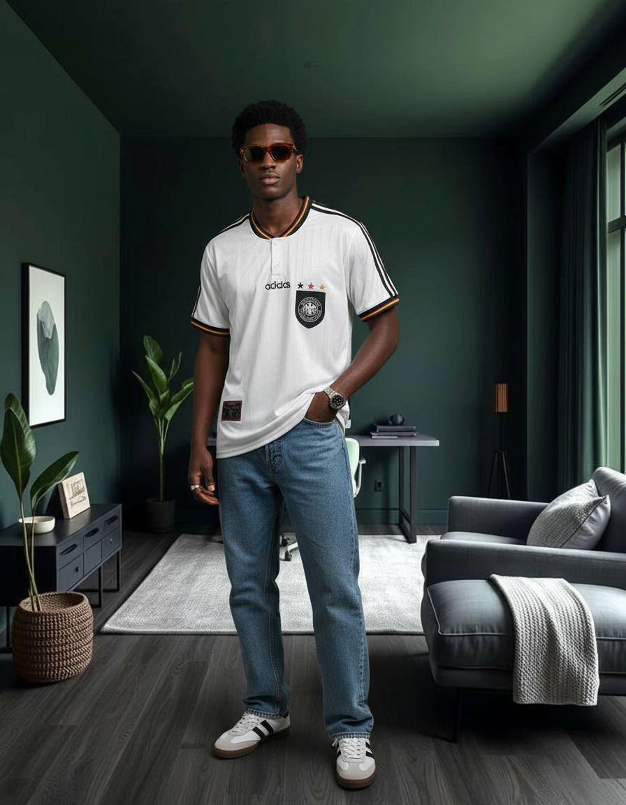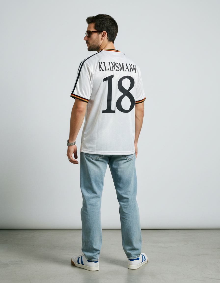 Camiseta Alemania 96 en blanco, con diseño minimalista, detalles en negro y vivos en los colores de la bandera en cuello y mangas. Un clásico elegante de la Eurocopa. ⚽ Vestida por figuras como Klinsmann, Bierhoff y Sammer, símbolo de una generación campeona.