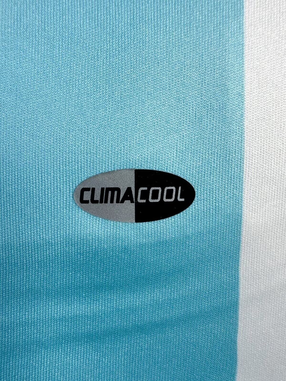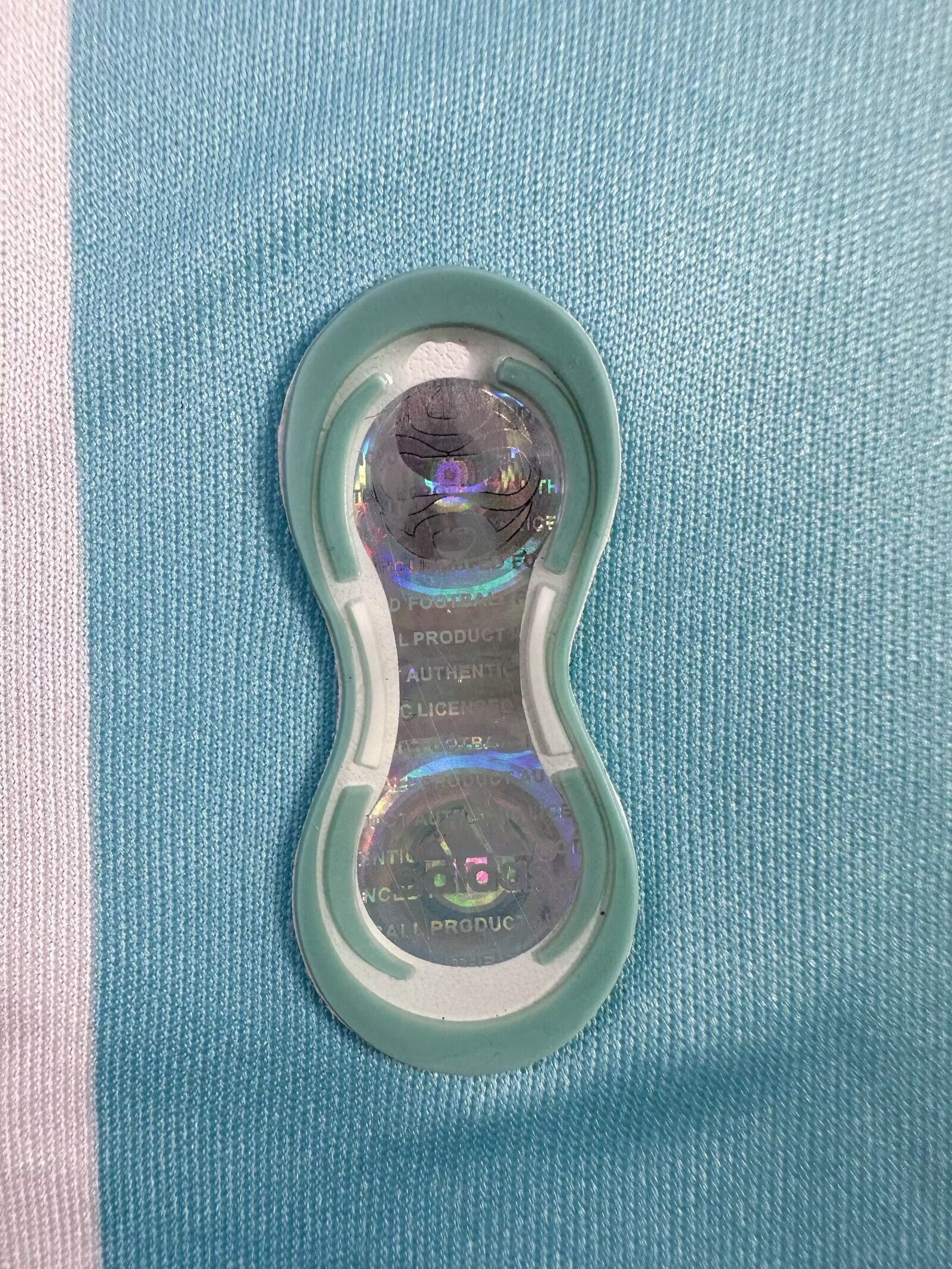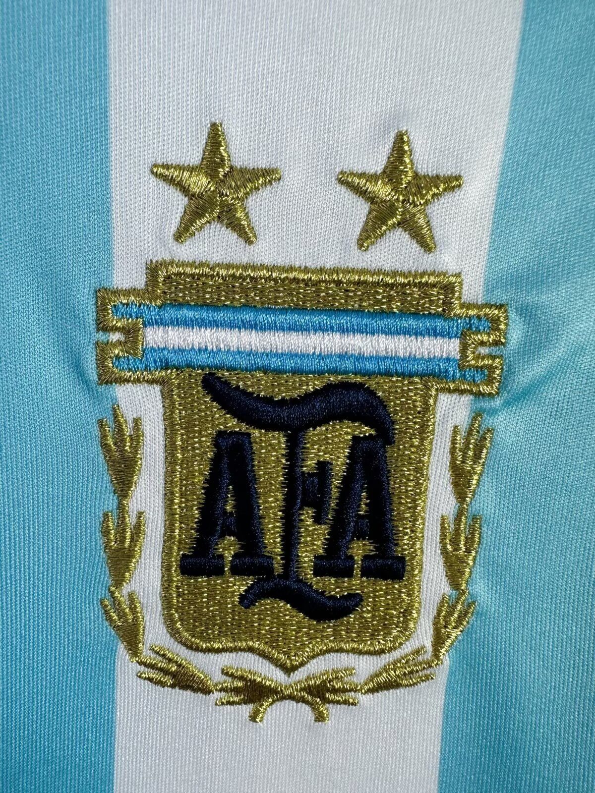 Camiseta Argentina 2006 con clásicas franjas celestes y blancas, mangas blancas con detalles en negro y acentos dorados al frente. Incluye cuello redondo celeste para un look elegante de Mundial. ⚽ Vestida por figuras como Messi, Riquelme y Tevez, símbolo de una generación llena de talento.