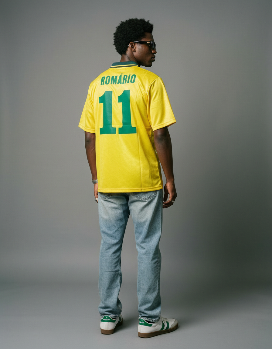 Camiseta Brasil 1993 en amarillo, con patrón geométrico sutil y cuello tipo polo verde con detalles en amarillo. Incluye acentos azules que resaltan su diseño clásico. ⚽ Vestida por figuras como Romário, Bebeto y Dunga, símbolo del talento brasileño.