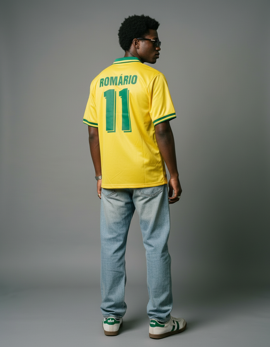 Camiseta Brasil 94 en amarillo, con cuello en V verde y detalles a juego en mangas. Incluye patrón sutil del escudo y estrellas que celebran su legado. Un clásico del Mundial campeón. 🏆⚽ Vestida por figuras como Romário, Bebeto y Dunga, símbolo de una generación inolvidable.