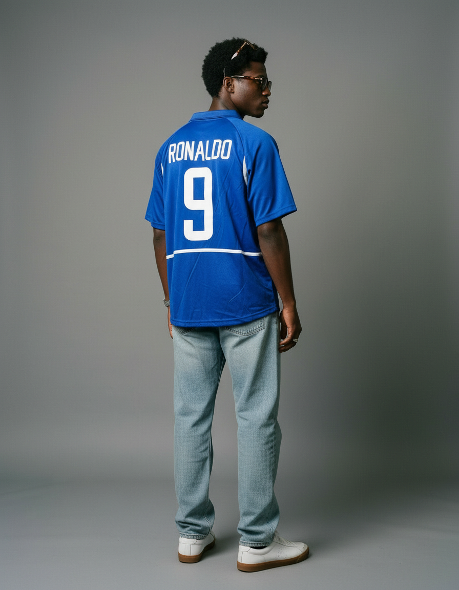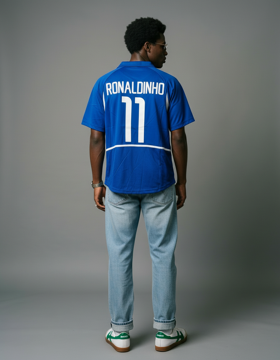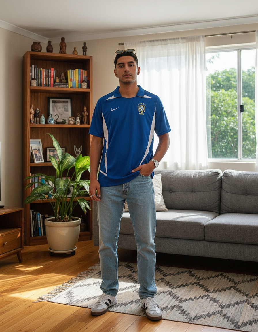 Camiseta visitante Brasil 2002 en azul vibrante, con paneles laterales en malla gris y detalles en blanco. Un diseño dinámico de la histórica campaña campeona del Mundial. 🏆⚽ Vestida por figuras como Ronaldo, Ronaldinho y Rivaldo, símbolo de una generación legendaria.