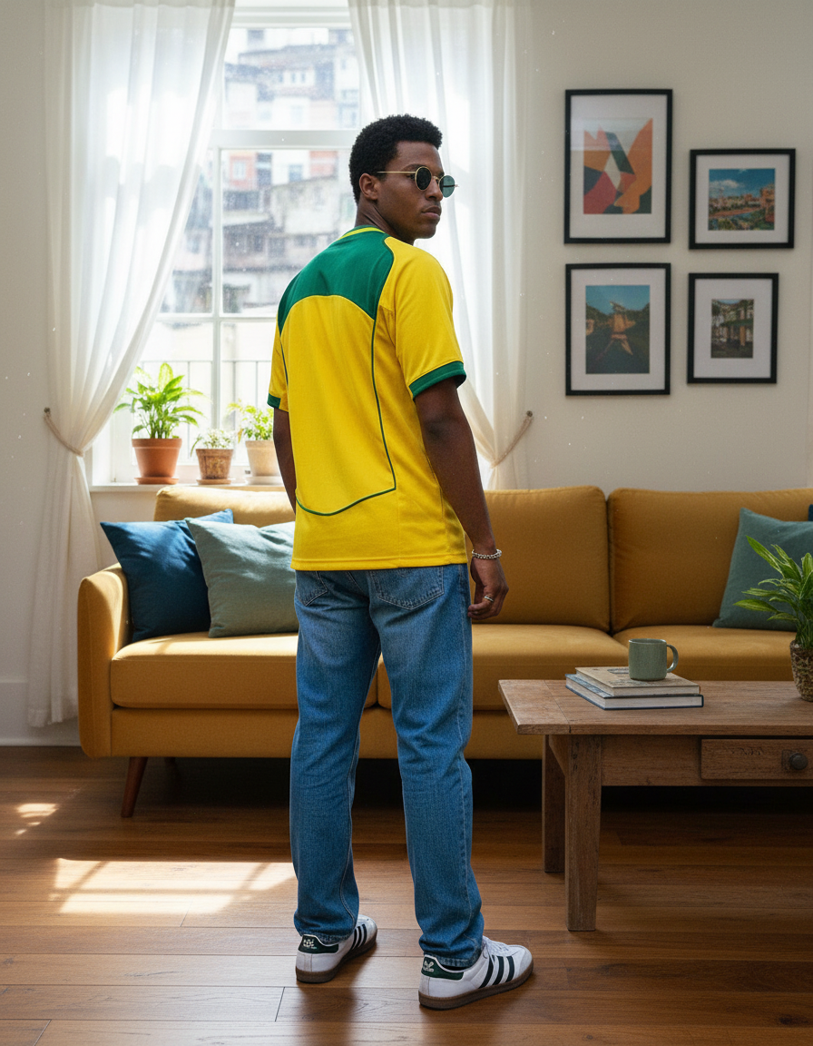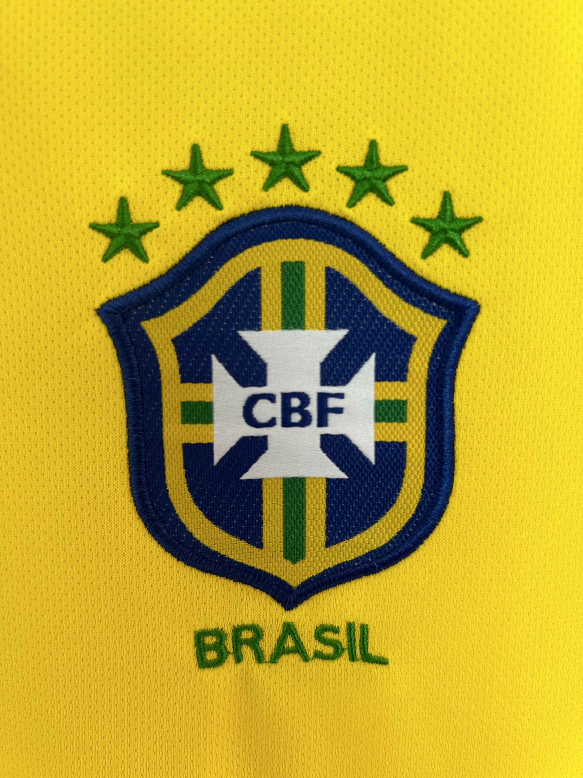 Camiseta Brasil 2004 en amarillo, con detalles en verde en cuello en V, mangas y laterales. Diseño Total 90 de la histórica Copa América campeona. 🏆⚽ Vestida por figuras como Adriano, Kaká y Ronaldinho, símbolo de una generación brillante.