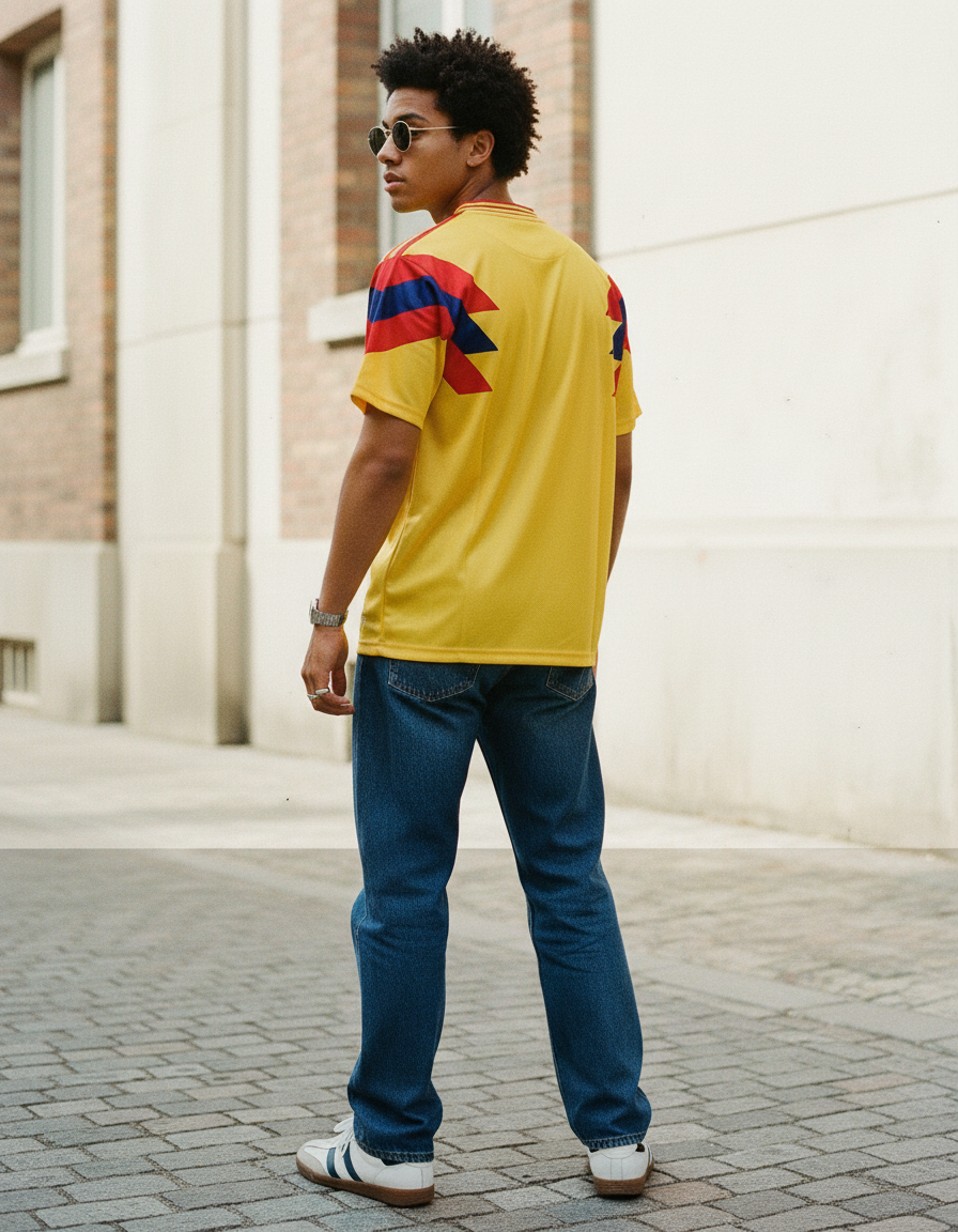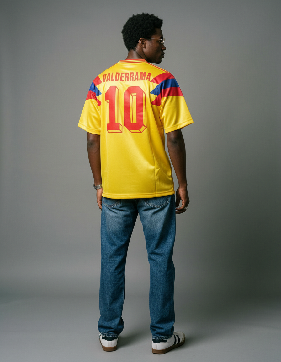 Camiseta Colombia 1990 en amarillo, con patrones geométricos en rojo y azul en hombros y mangas, y cuello multicolor. Un diseño icónico del Mundial que marcó época. ⚽ Vestida por figuras como Valderrama, Rincón y Higuita, símbolo de una generación inolvidable.
