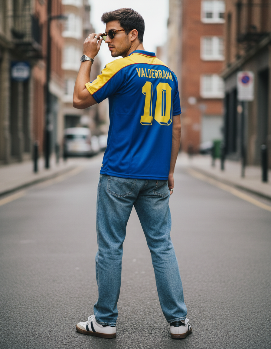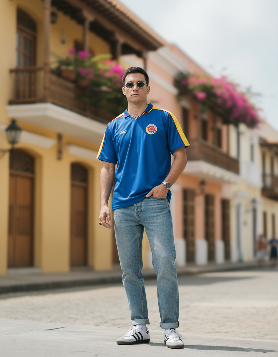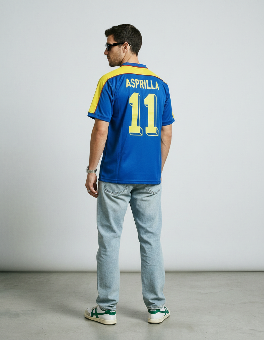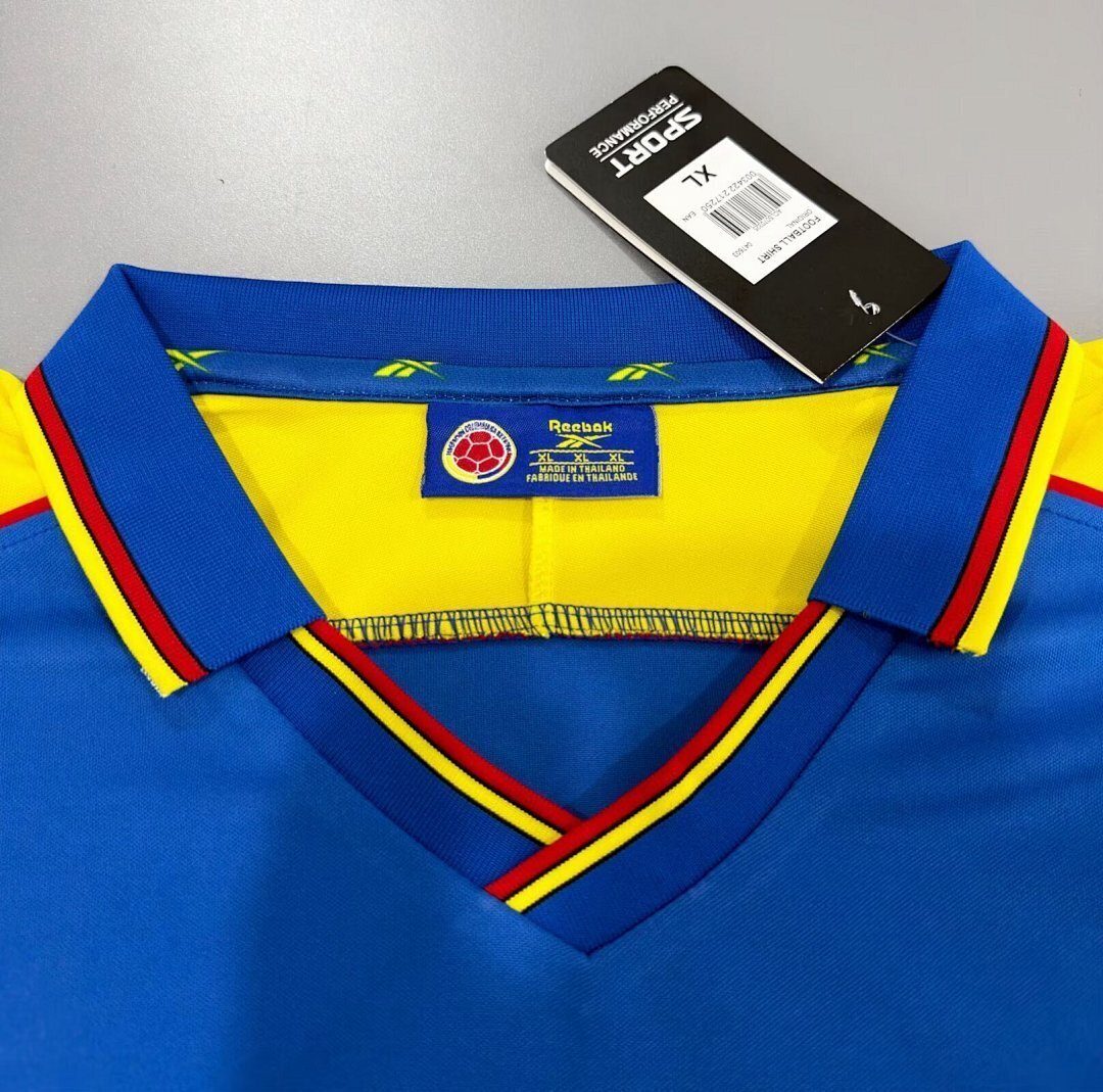 Camiseta visitante Colombia 1998 en azul, con paneles amarillos en hombros y detalles tricolor en el cuello en V. Un diseño distintivo del Mundial. ⚽ Vestida por figuras como Valderrama, Asprilla y Rincón, símbolo de una generación inolvidable.