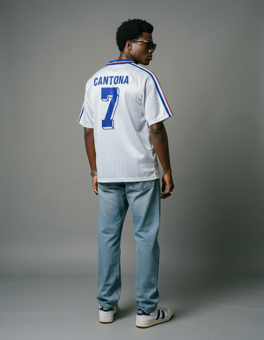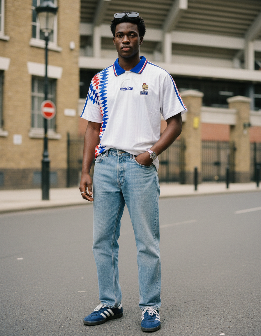 Camiseta visitante Francia 1994 en blanco, con panel vertical de rombos en azul y rojo y cuello tipo polo azul con detalles tricolor. Un diseño retro distintivo de la época. ⚽ Vestida por figuras como Cantona, Deschamps y Ginola, símbolo de una generación con carácter.