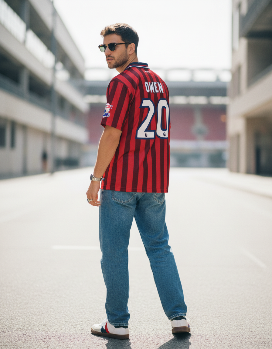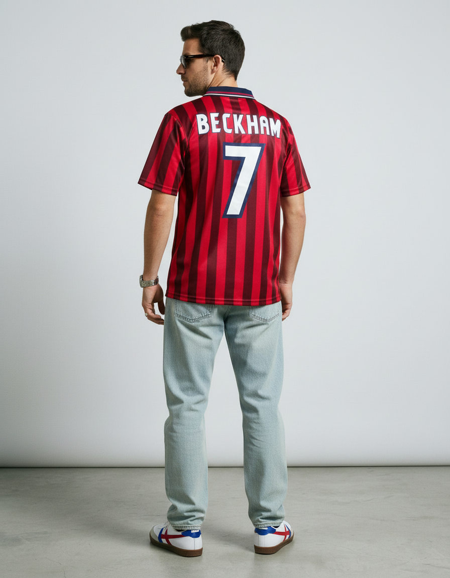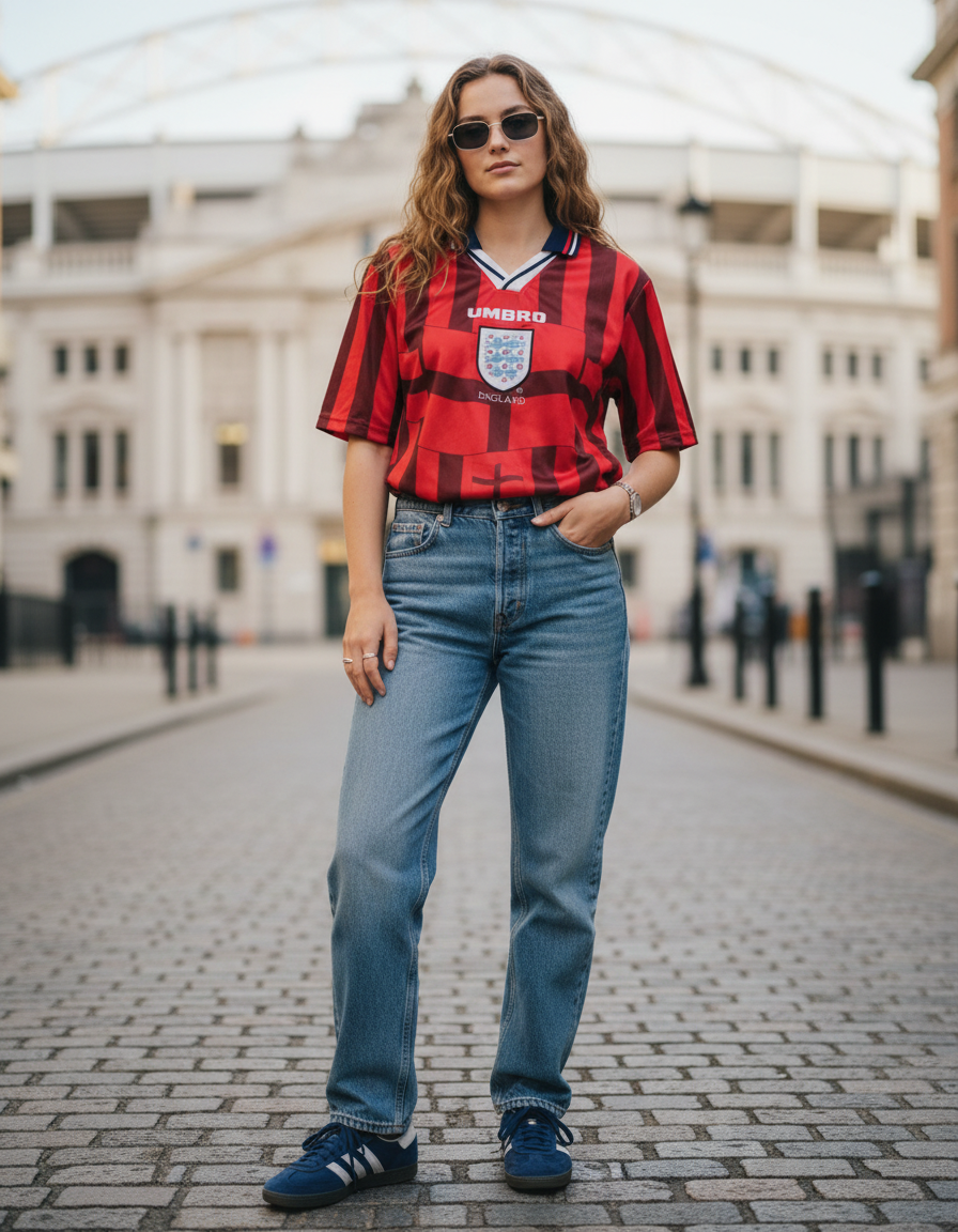 Camiseta visitante Inglaterra 98 en rojo, con diseño tonal y detalles en azul y blanco en cuello y mangas. Un clásico del Mundial con identidad única y estilo retro. ⚽ Vestida por figuras como Beckham, Owen y Shearer, símbolo de una generación inolvidable.