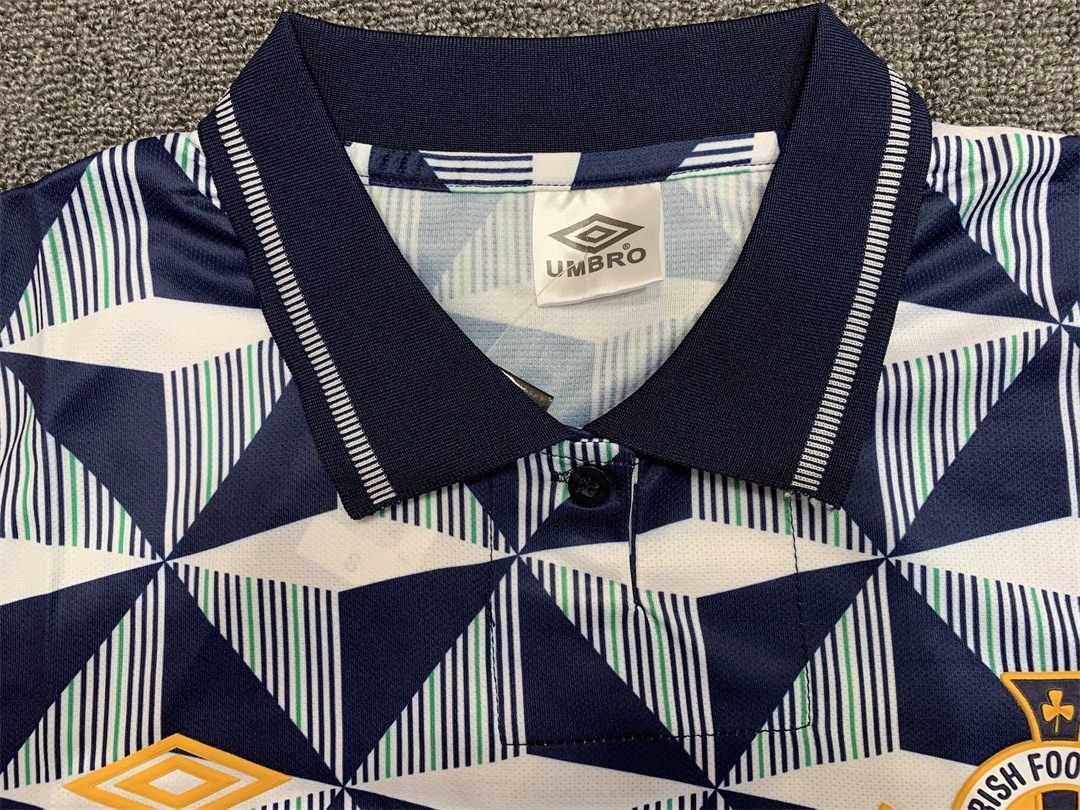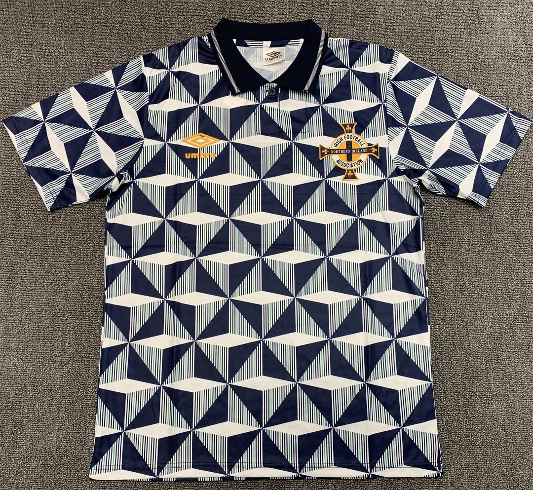 Camiseta visitante Irlanda del Norte 1990, con diseño geométrico efecto 3D en tonos azul y blanco. Incluye cuello tipo polo y un estilo retro que no pasa desapercibido. ⚽🔥