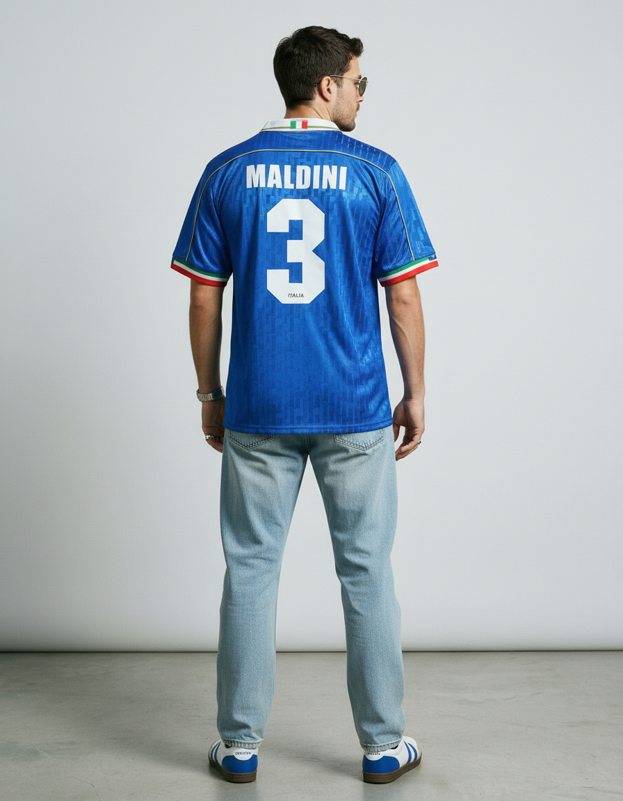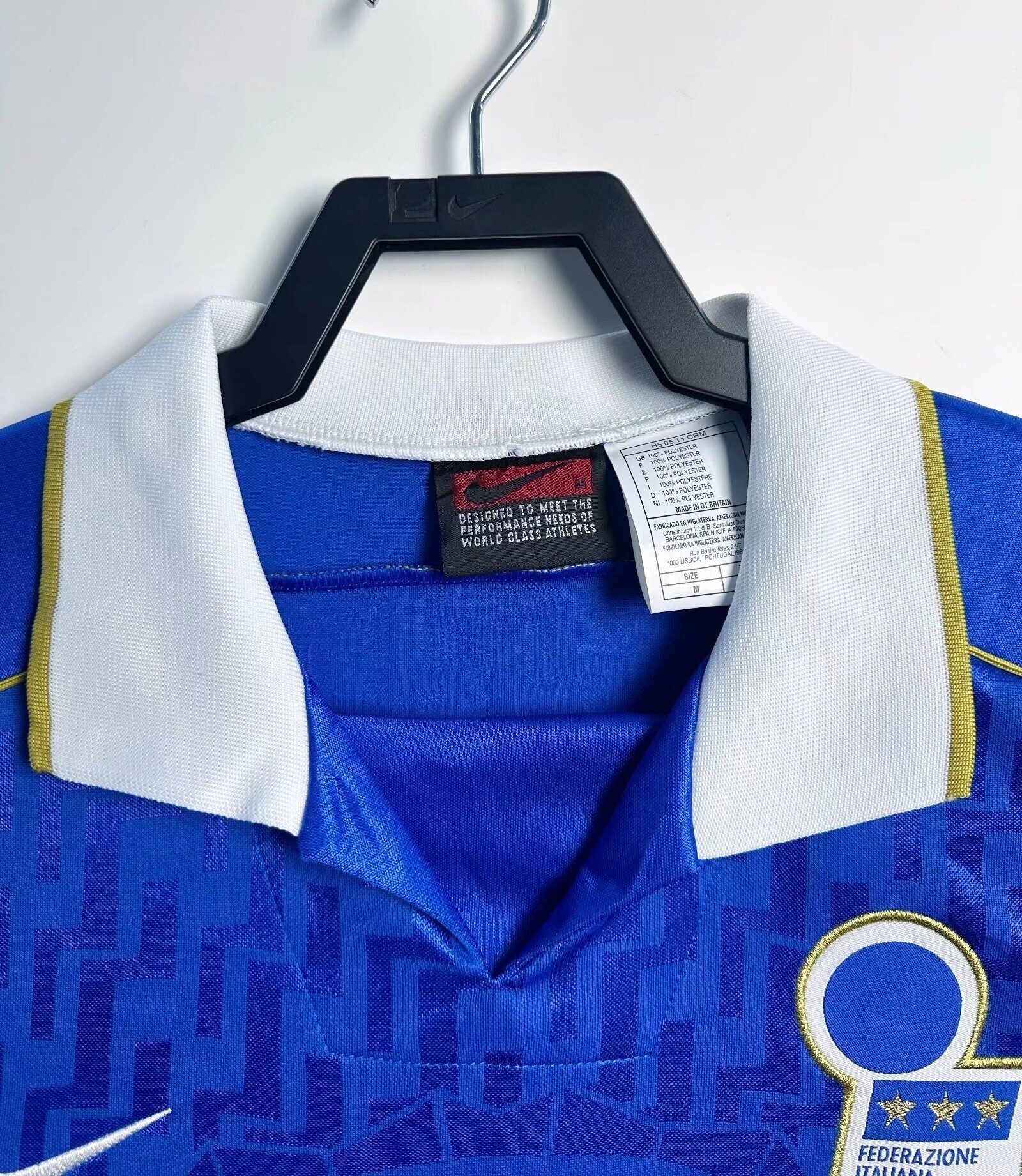 Camiseta Italia 1995 en azul, con estampado en relieve, cuello blanco y detalles dorados en los hombros. Incluye puños tricolor que resaltan su estilo clásico. ⚽ Vestida por figuras como Baggio, Maldini y Del Piero, símbolo de una generación histórica