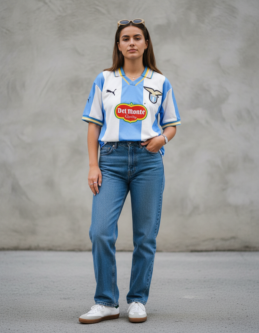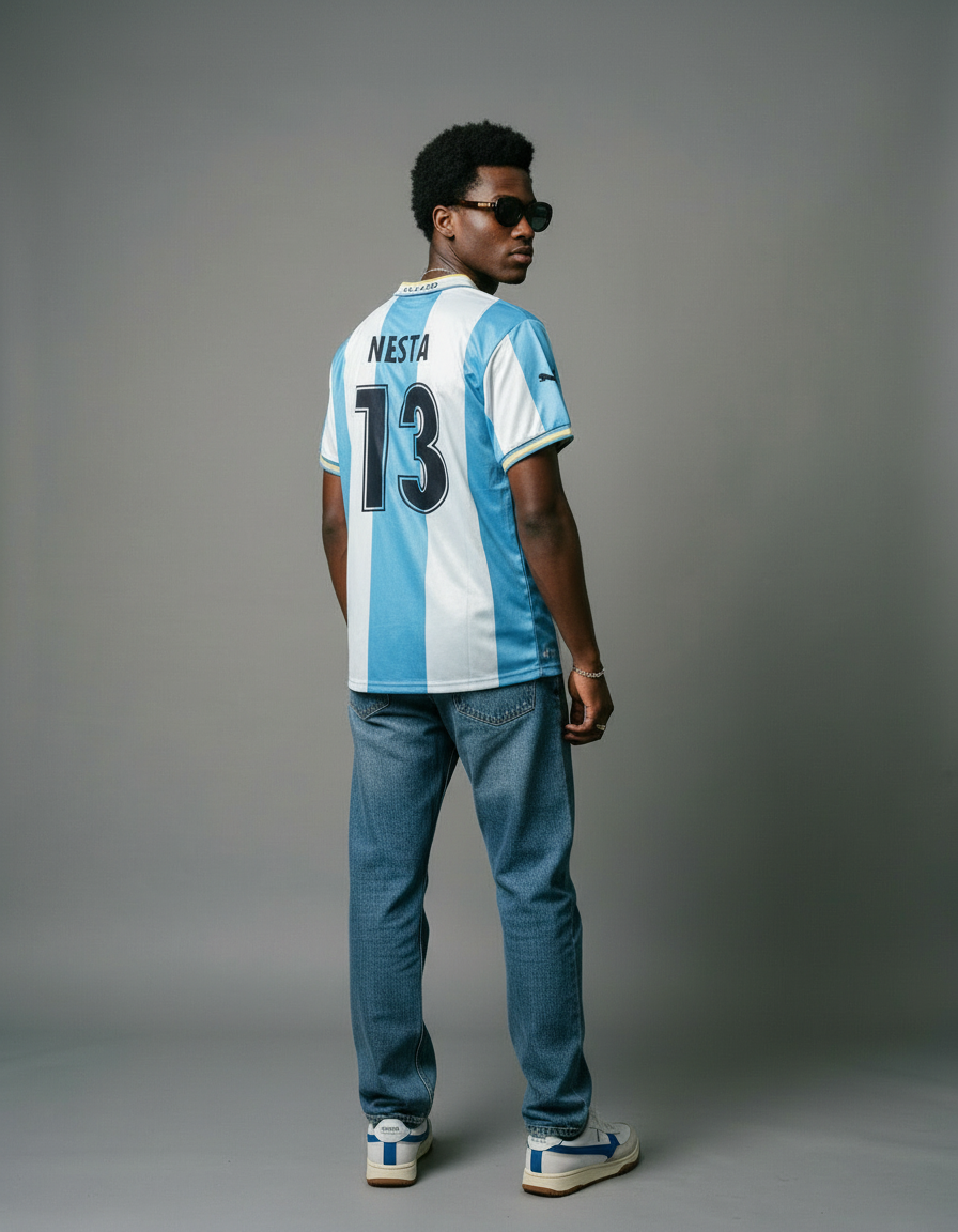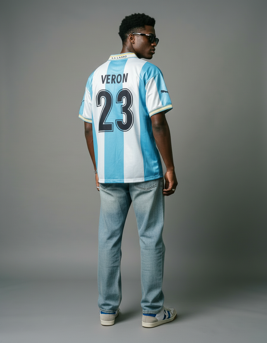 Camiseta Lazio Champions League 99-00 con franjas verticales en celeste y blanco, cuello tipo polo y detalles en dorado que elevan su estilo clásico. Un diseño distintivo de competición europea. 🔵⚪🏆 Vestida por figuras como Nesta, Verón y Nedvěd, símbolo de una gran era del club.
