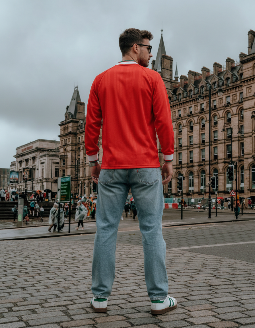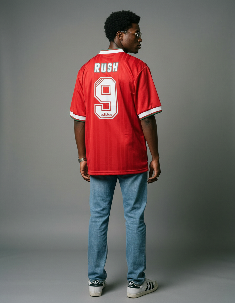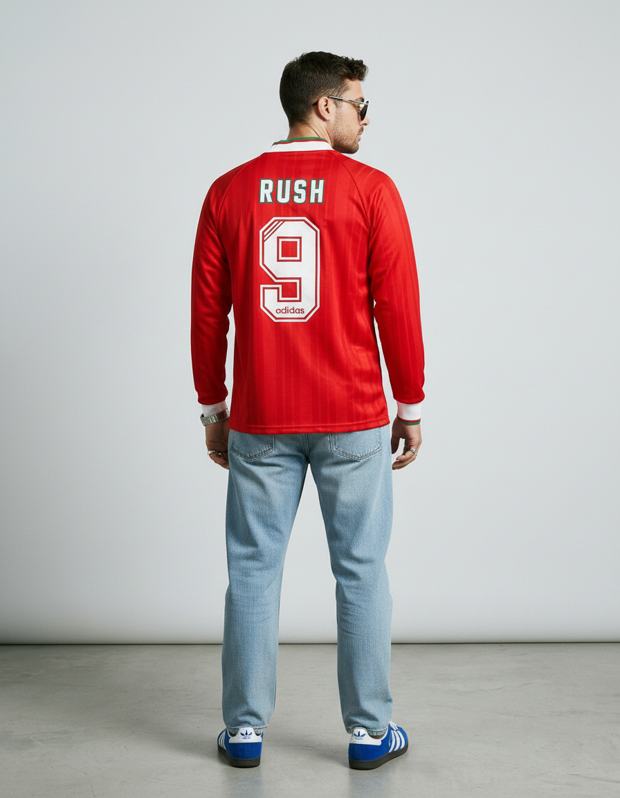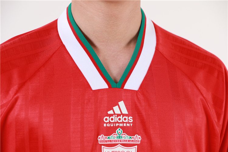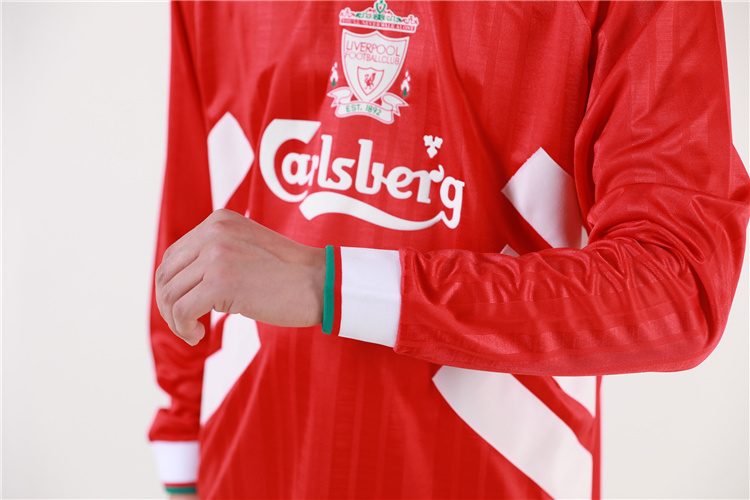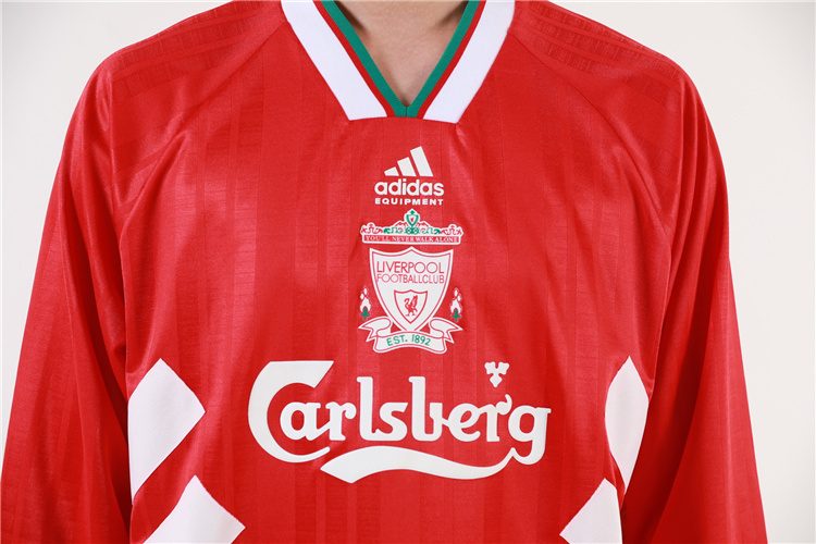 Camiseta Liverpool 94-95 en rojo, con paneles laterales diagonales en blanco, cuello en V blanco y detalles en verde en los puños. Un diseño distintivo de una temporada con título. 🔴⚽🏆 Vestida por figuras como Ian Rush, Fowler, McManaman y Redknapp, símbolo de una generación clave del club.