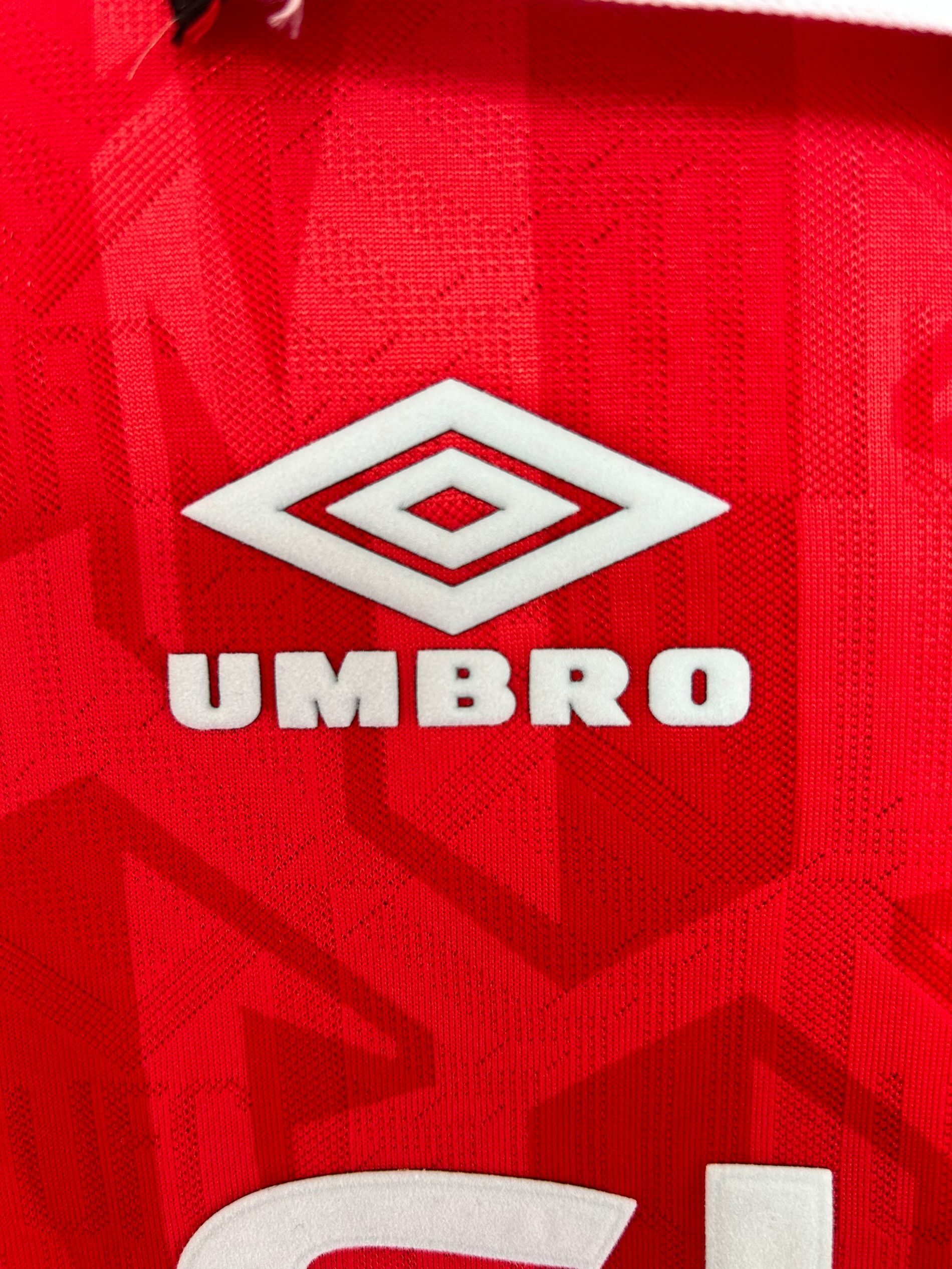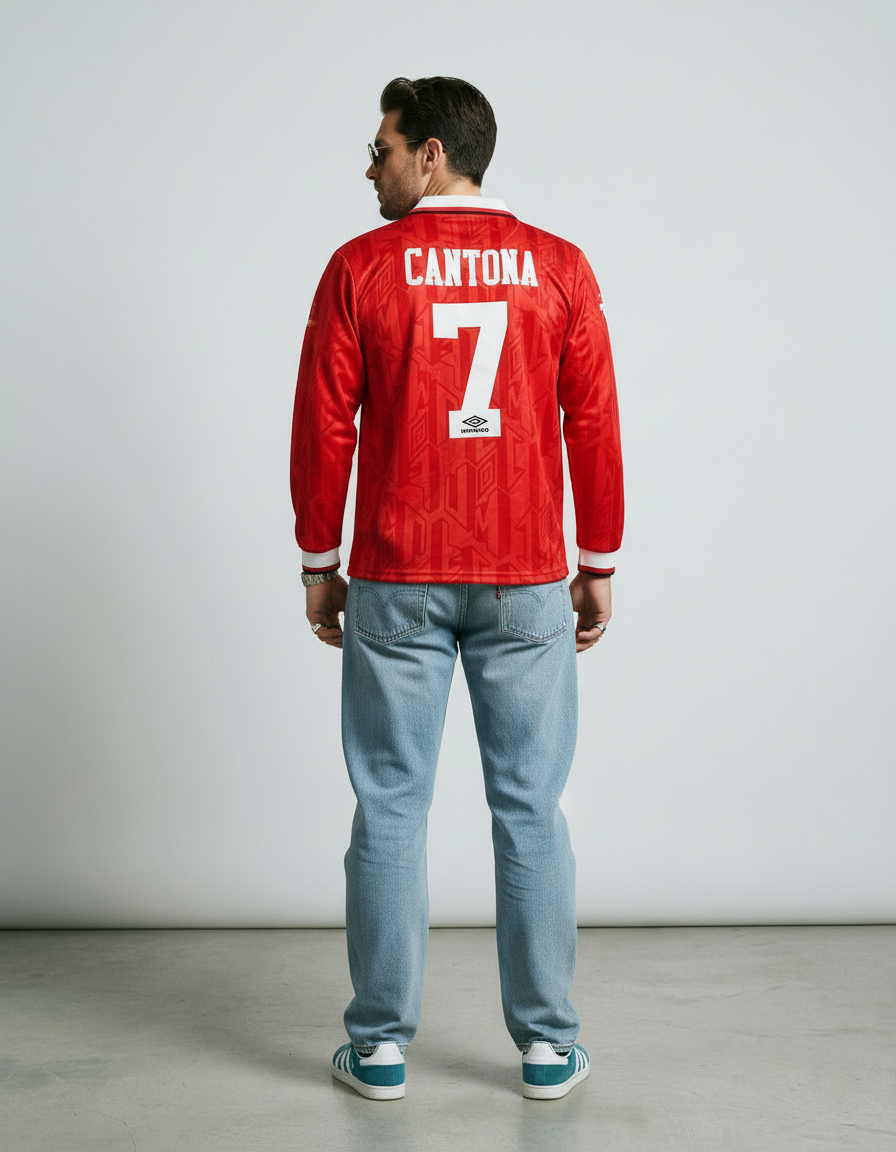 Camiseta local Manchester United 93-94 en rojo, con diseño geométrico sublimado y clásico cuello blanco con cordones. Un ícono del histórico doblete de Premier League y FA Cup. 🏆🔴 Vestida por leyendas como Beckham, Cantona, Giggs y Scholes, símbolo de una era inolvidable.