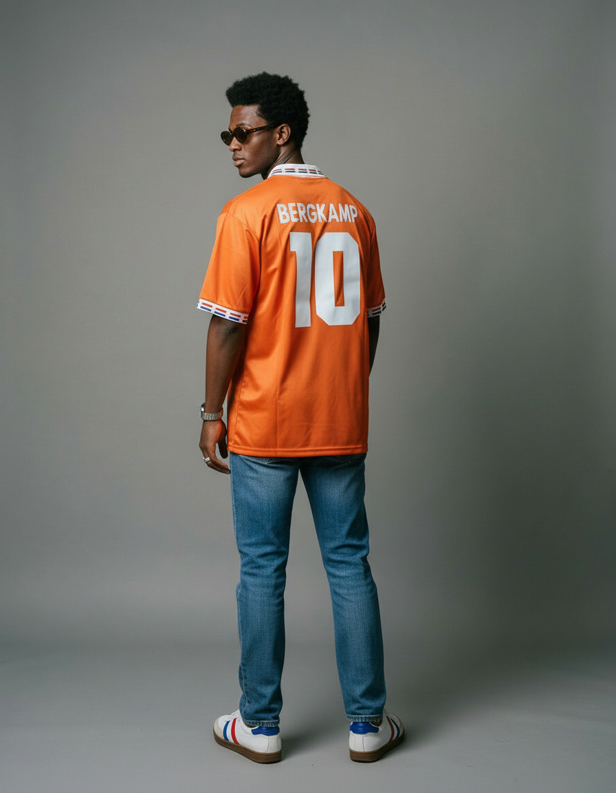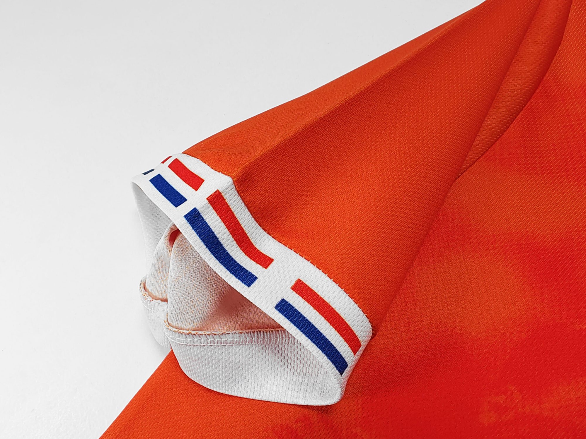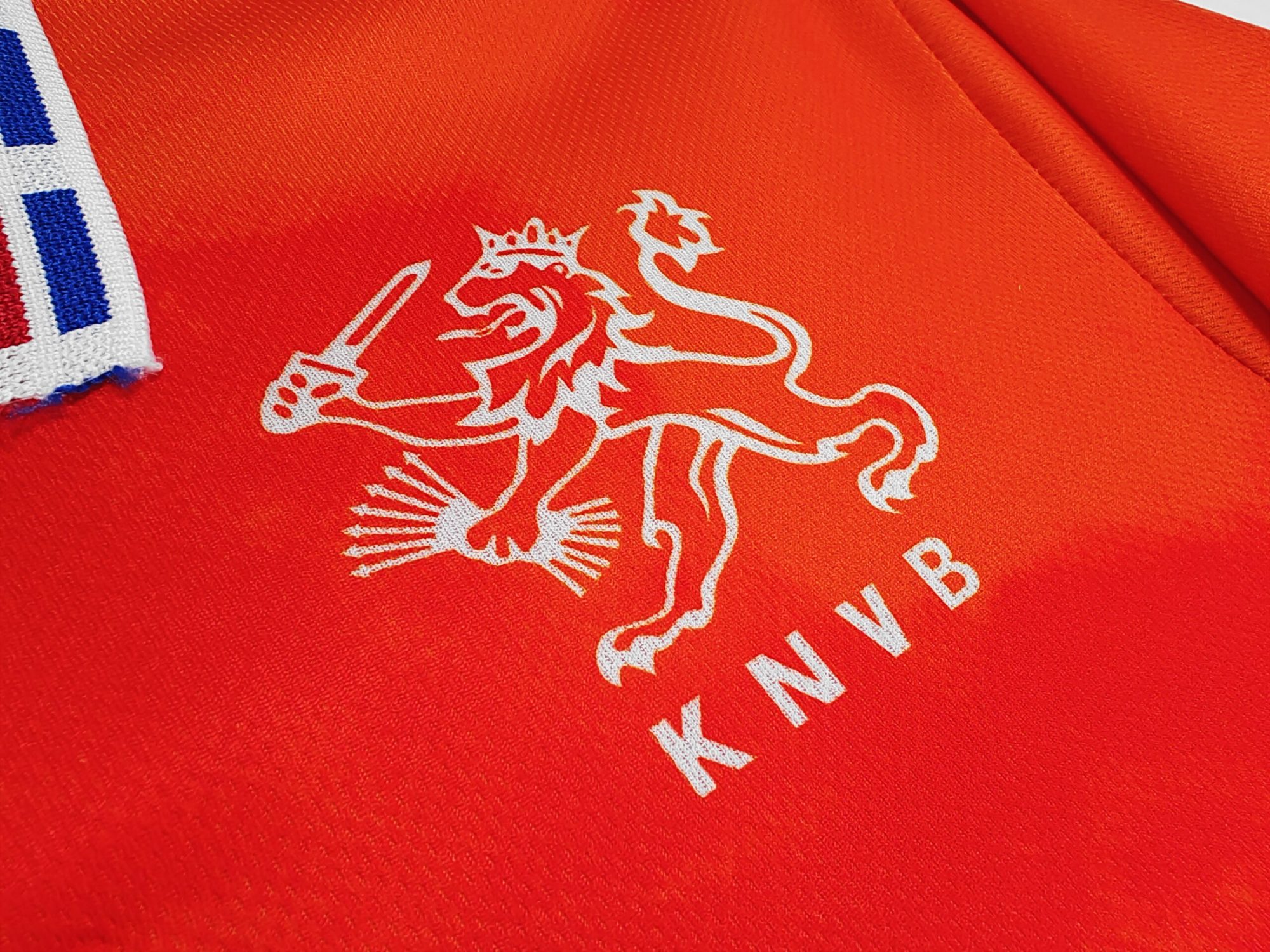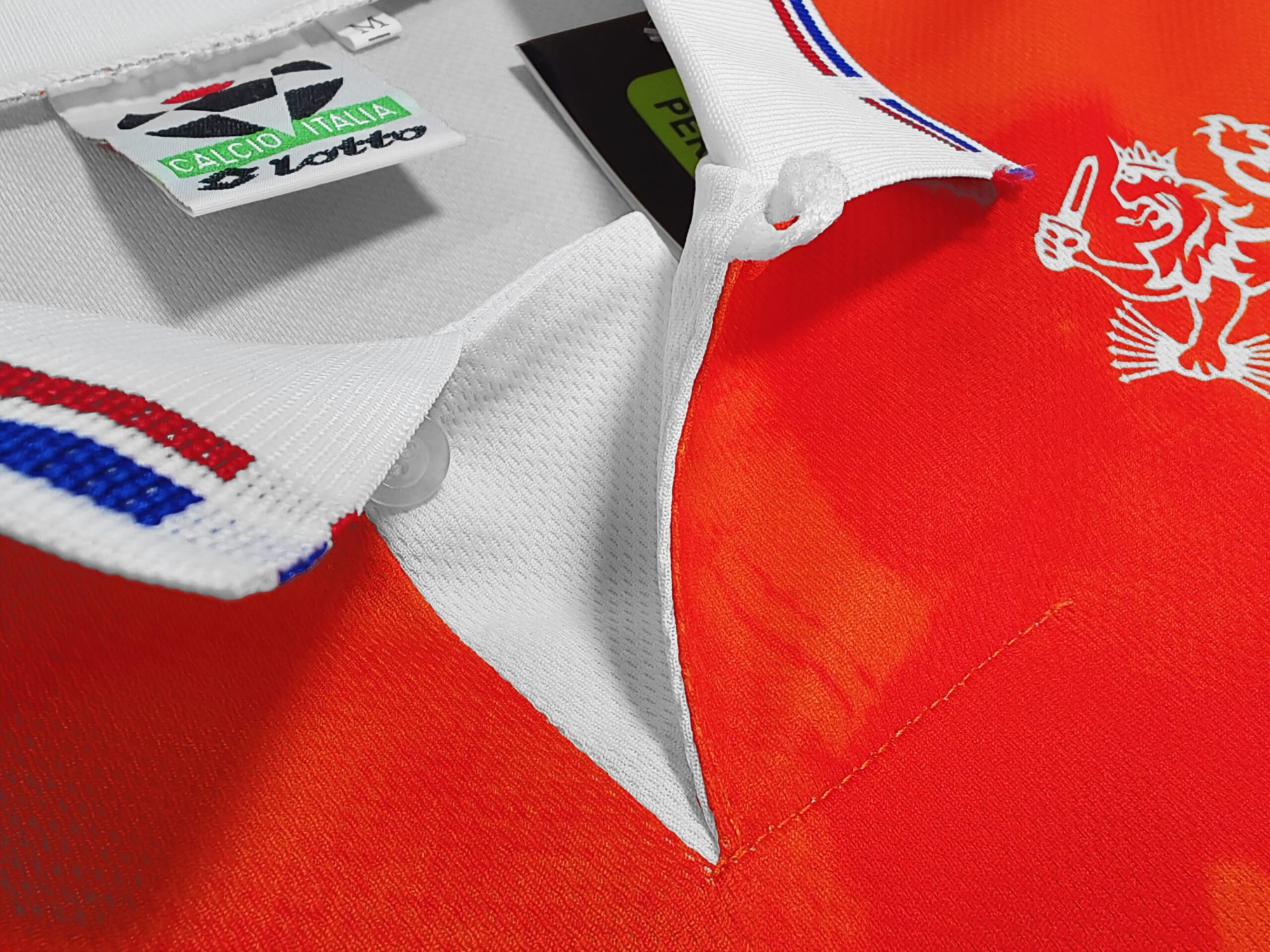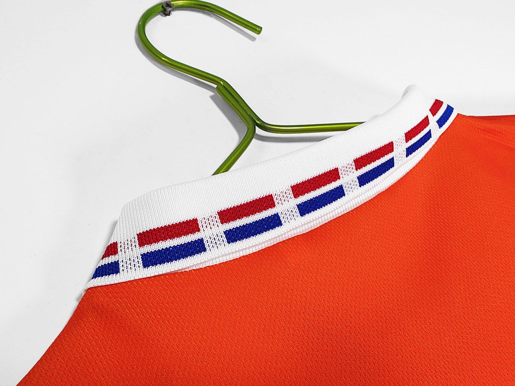 Camiseta Países Bajos 1996 en naranja, con estampado tonal sutil y cuello tipo polo blanco con detalles tricolor. Un diseño elegante de la Eurocopa. ⚽ Vestida por figuras como Bergkamp, Kluivert y Davids, símbolo de una generación talentosa.