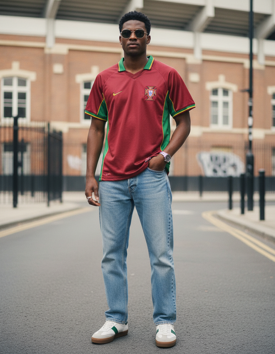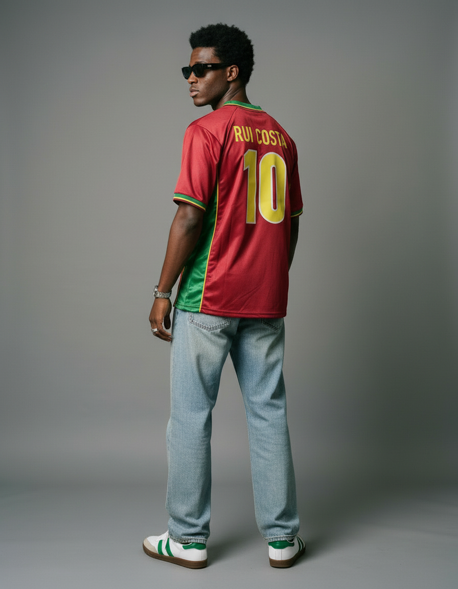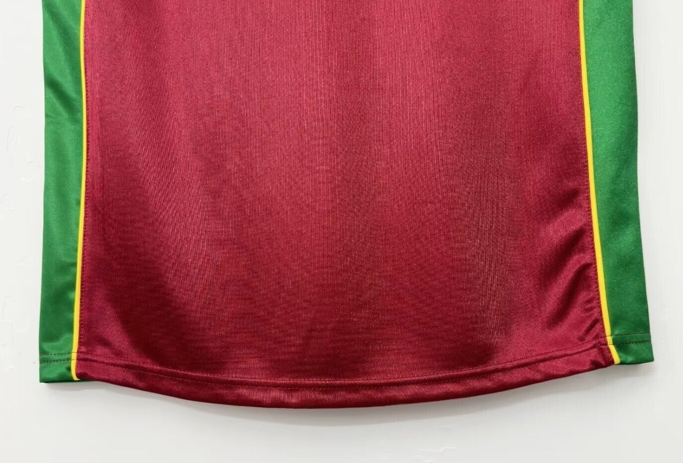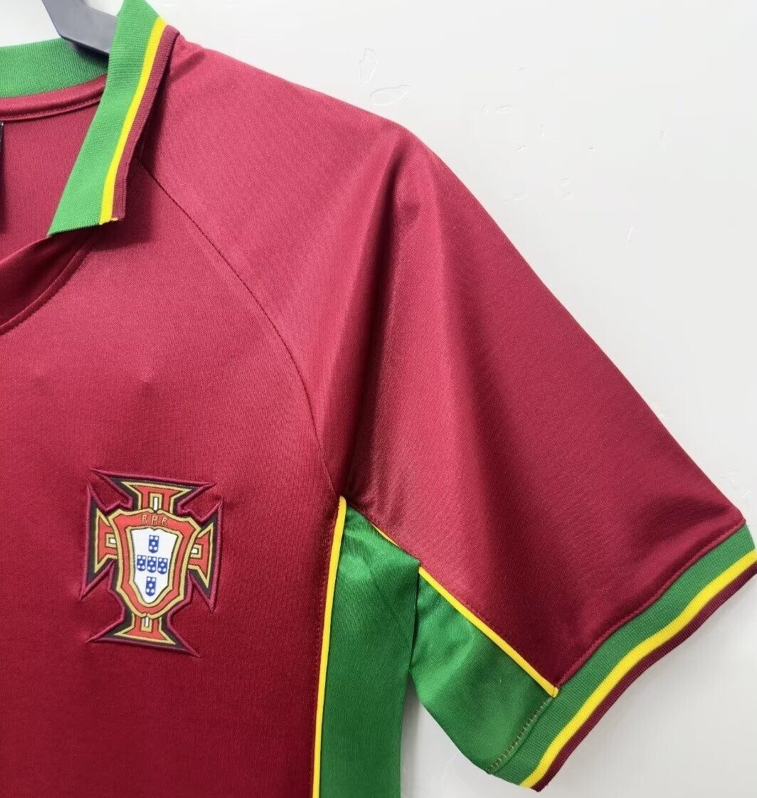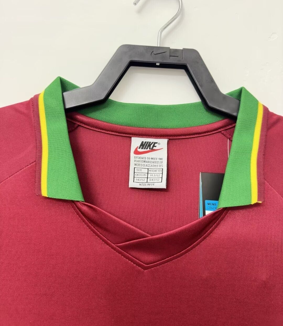 Camiseta Portugal 1997 en rojo burdeos, con cuello tipo polo en V y detalles en verde y amarillo en laterales y mangas. Un diseño clásico de la era noventera. ⚽ Vestida por figuras como Figo, Rui Costa y João Pinto, símbolo de una generación talentosa.