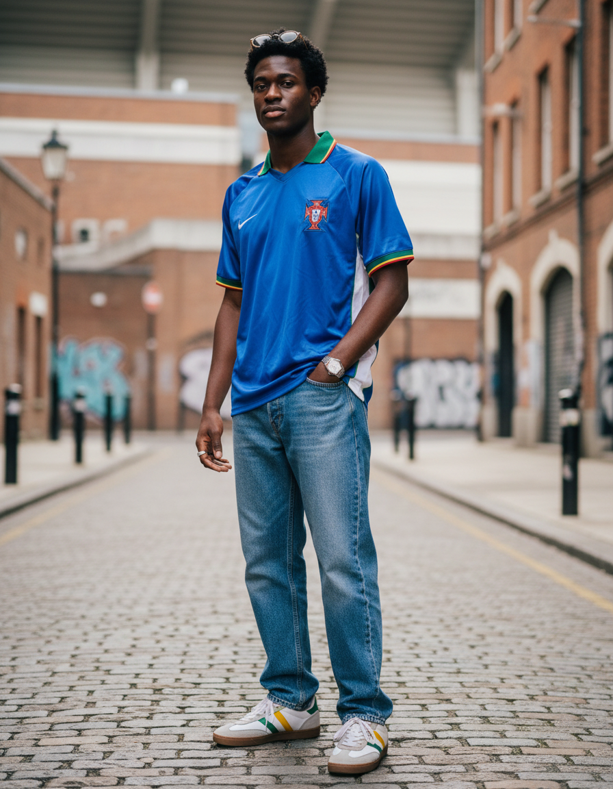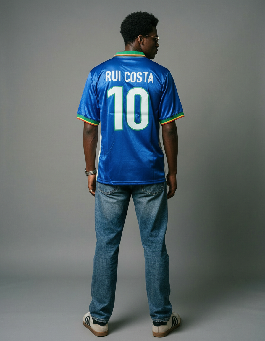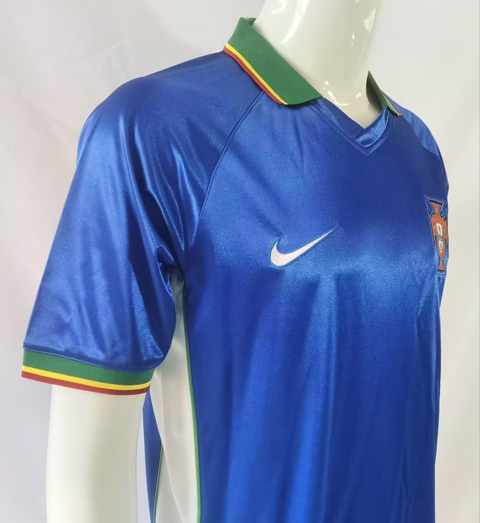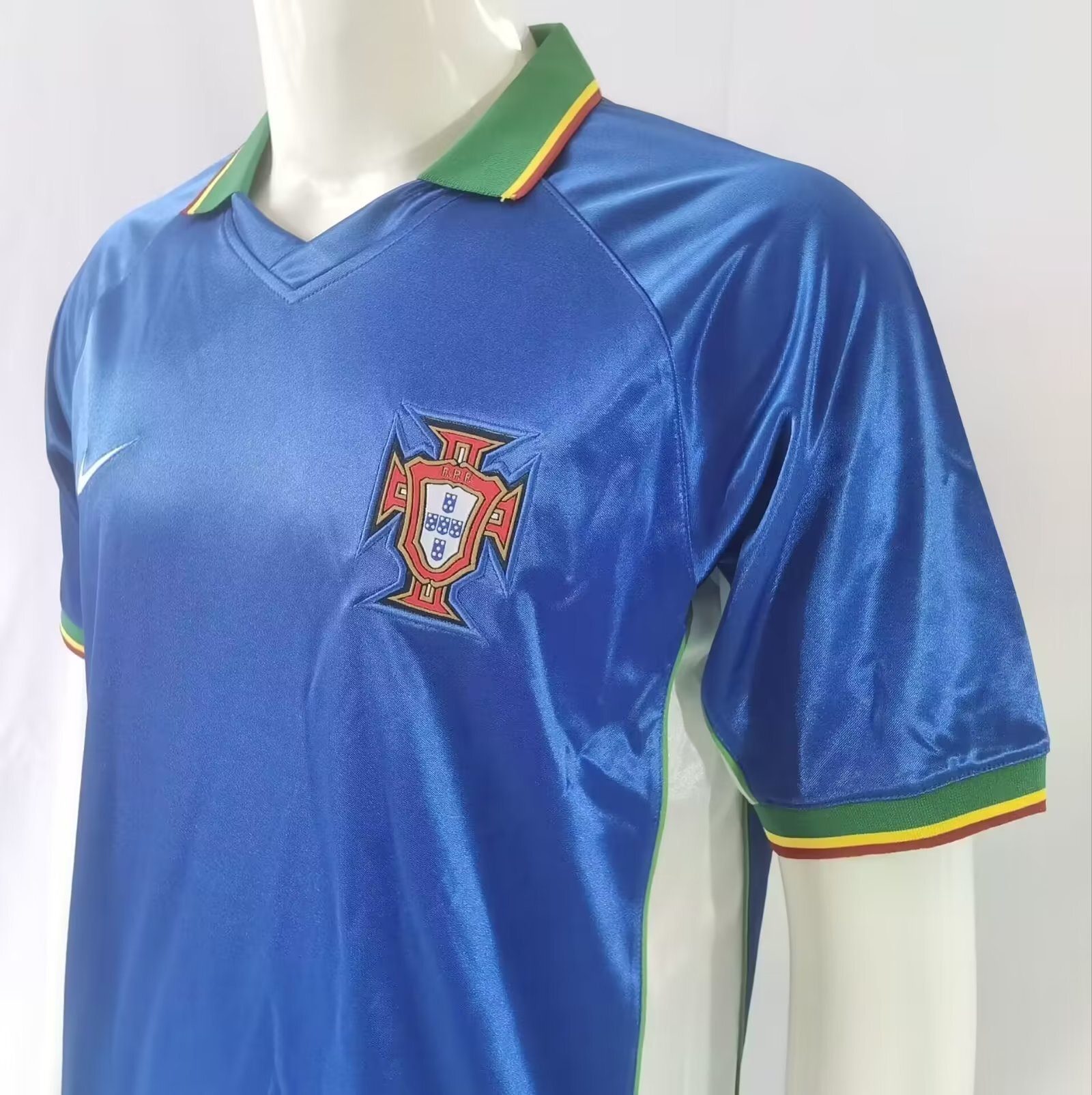 Camiseta visitante Portugal 1997 en azul, con cuello tipo polo en verde y detalles tricolor en mangas y acabados. Incluye paneles laterales en contraste que realzan su diseño noventero. ⚽ Vestida por figuras como Figo, Rui Costa y João Pinto, símbolo de una generación con gran talento.