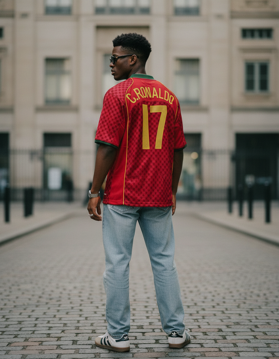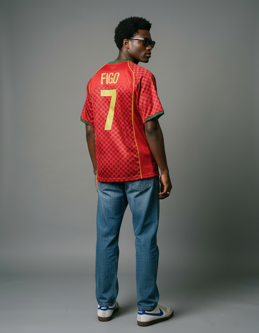 Camiseta Portugal 2004 en rojo, con patrón tonal de rombos y detalles en verde en cuello y mangas. Un diseño icónico de la Eurocopa donde alcanzaron la final. ⚽ Vestida por figuras como Figo, Cristiano Ronaldo y Deco, símbolo de una generación inolvidable.