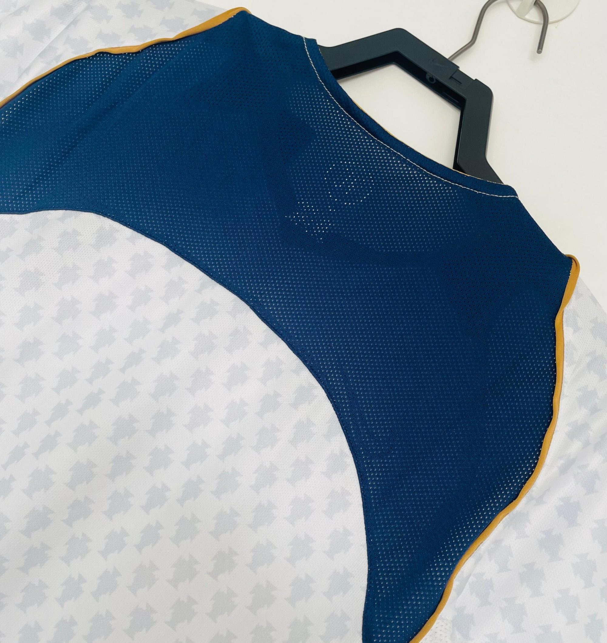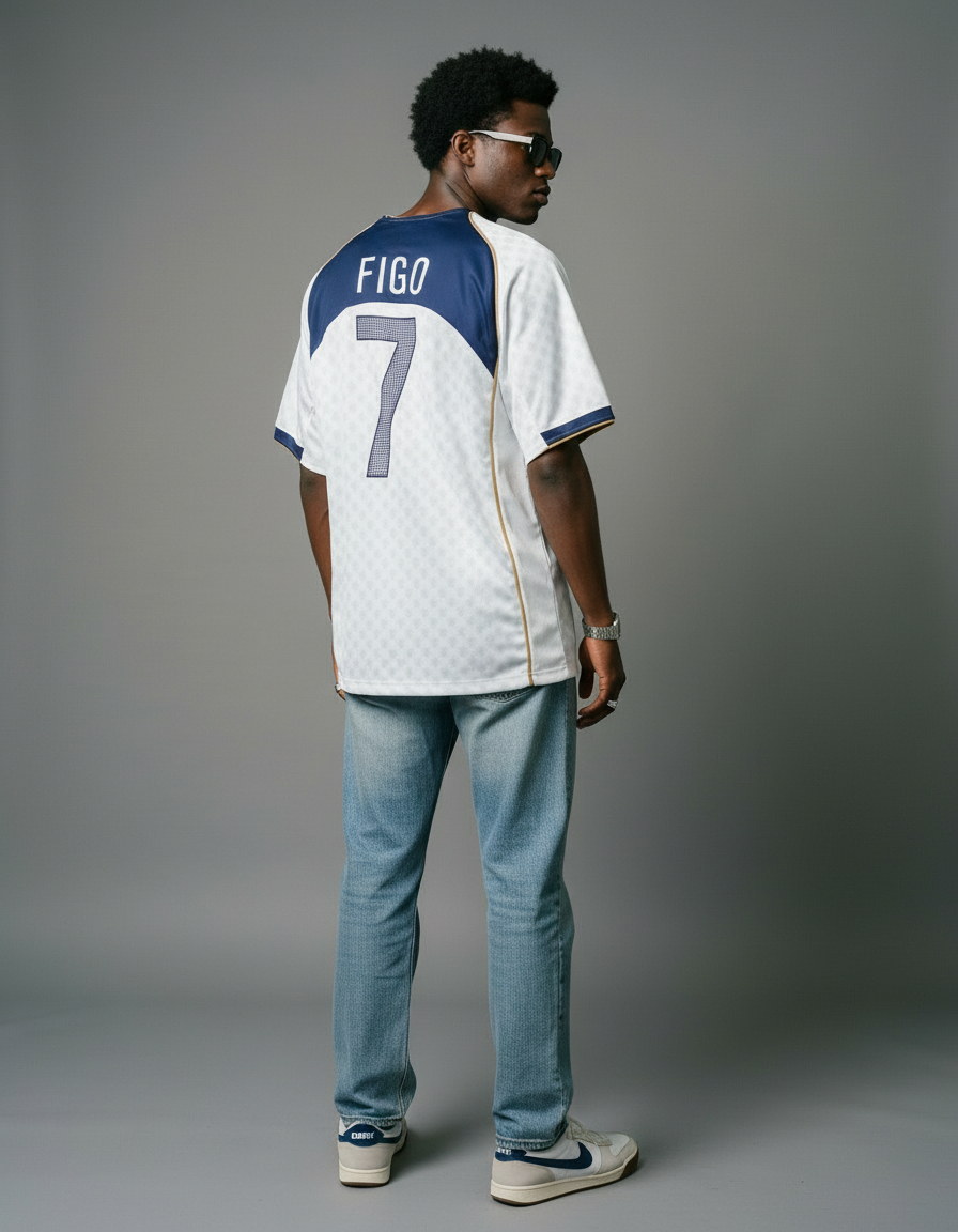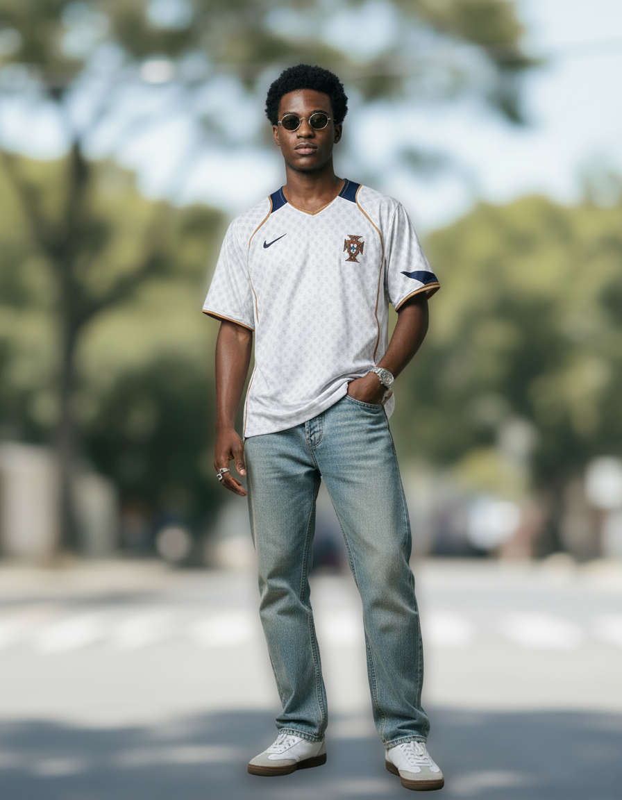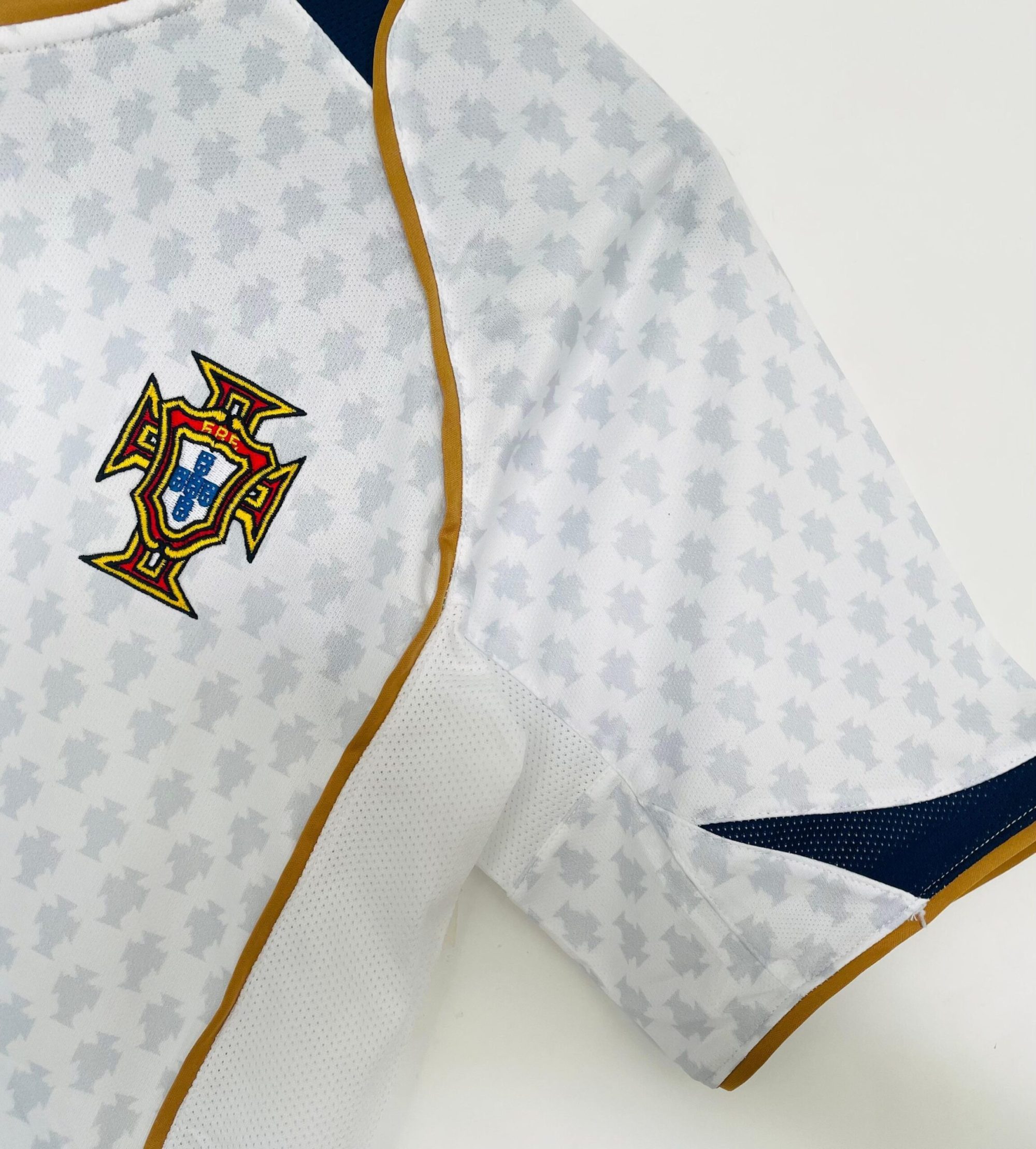 Camiseta visitante Portugal 2004 en blanco, con estampado sutil de rombos, detalles dorados y acentos en azul marino en cuello y mangas. Un diseño sofisticado de la Eurocopa. ⚽ Vestida por figuras como Figo, Cristiano Ronaldo y Deco, símbolo de una generación brillante.